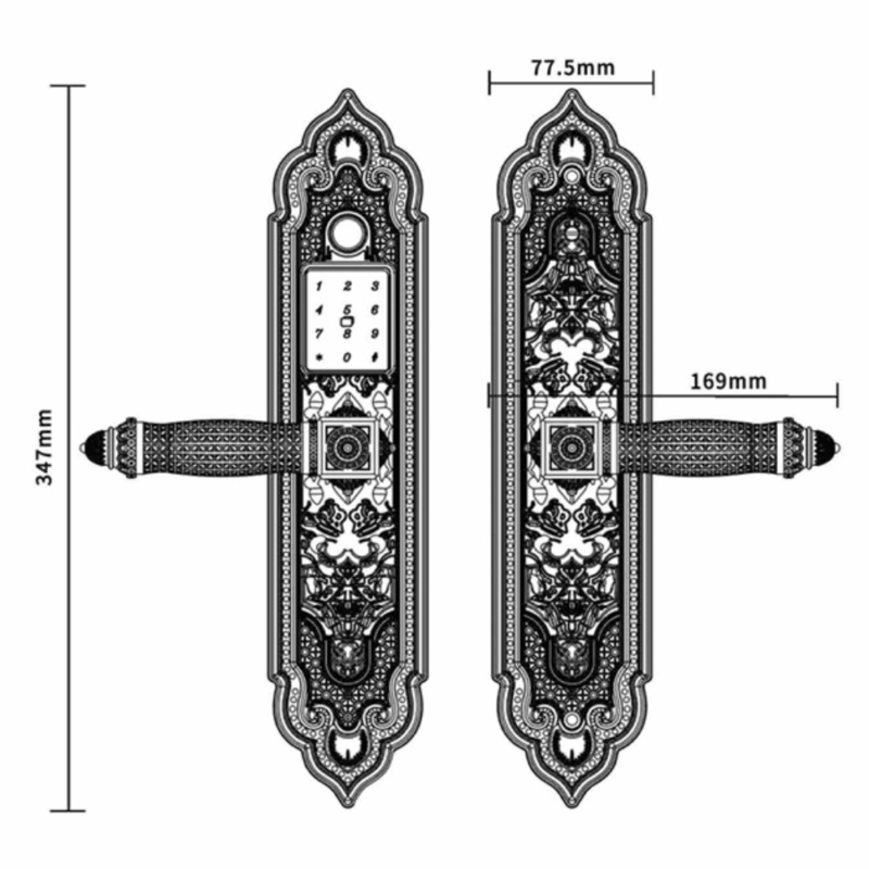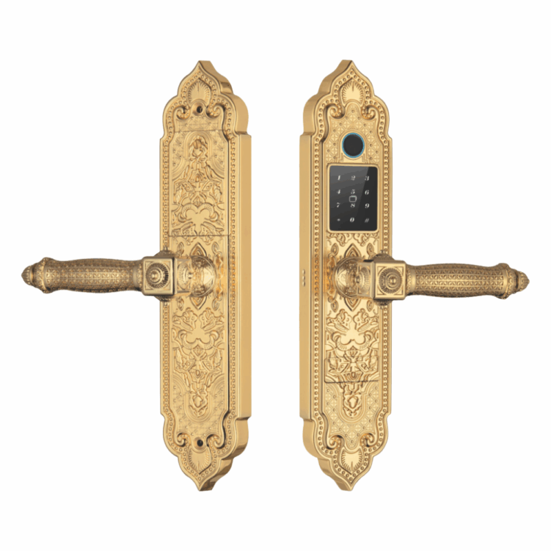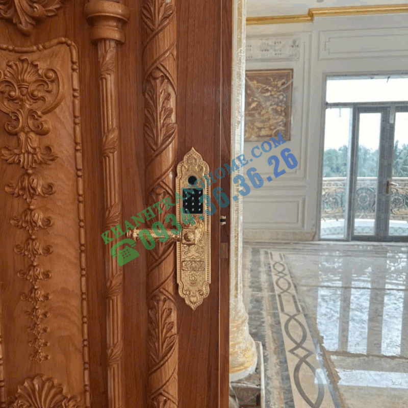 - Thiết kế tân cổ điển sang trọng: Khóa được làm từ đồng nguyên chất, mạ vàng, giúp giữ gìn vẻ đẹp và không bị xuống màu theo thời gian. Ngoại quan sang trọng, phù hợp với không gian biệt thự.