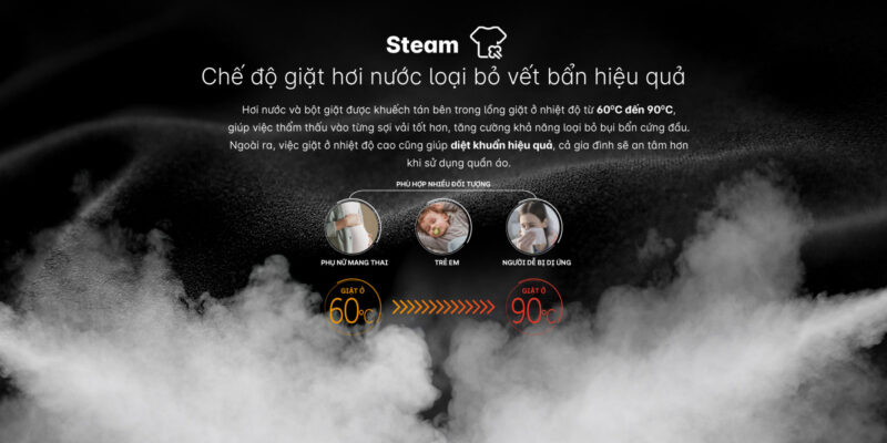 Công nghệ Steam sử dụng nước nóng giúp hòa tan bột giặt nhanh và đánh bay vết bẩn hiệu quả. Hơi nước nóng hỗ trợ loại bỏ vi khuẩn và các tác nhân gây dị ứng trên sợi vải. Quần áo sau giặt sạch sâu hơn và an toàn cho làn da nhạy cảm.