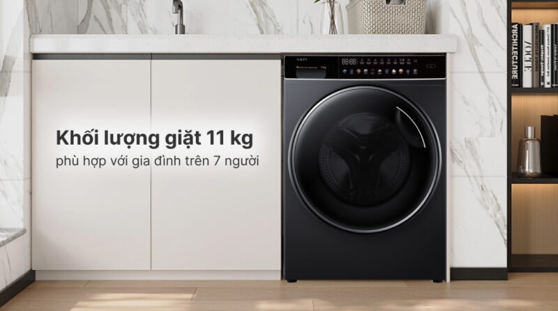 Với khả năng giặt lên đến 11 kg, máy đáp ứng hiệu quả nhu cầu giặt giũ của gia đình trên 7 thành viên. Dung tích lớn giúp giặt được nhiều quần áo trong một lần, tiết kiệm thời gian và công sức sử dụng hằng ngày.