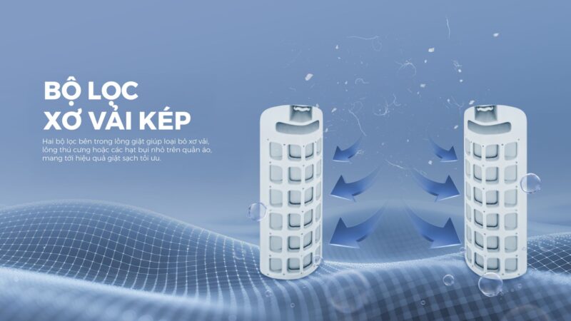 Bộ lọc xơ vải kép được bố trí bên trong lồng giặt giúp giữ lại xơ vải, lông thú cưng và bụi bẩn nhỏ. Điều này giúp quần áo sạch hơn và lồng giặt luôn thông thoáng.