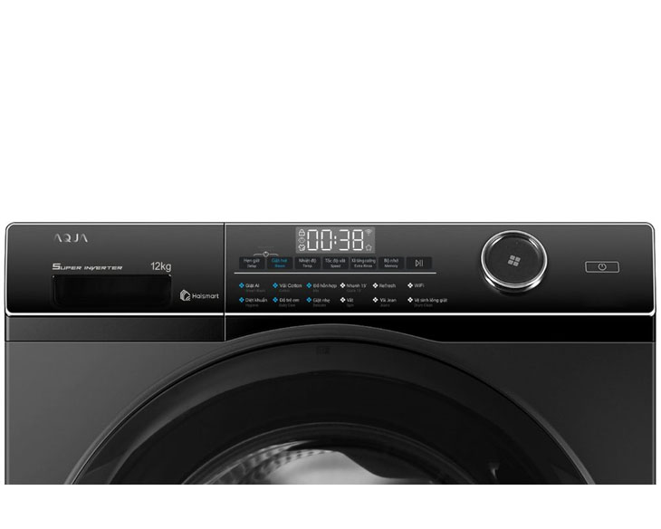 - Máy giặt Aqua Inverter 12 kg AW12-BP4959U1K(B) sở hữu thiết kế cửa trước hiện đại với tông màu đen sang trọng, dễ dàng hòa hợp với nhiều không gian nội thất. Bảng điều khiển cảm ứng kết hợp núm xoay trực quan, hỗ trợ tiếng Việt giúp người dùng thao tác nhanh chóng và thuận tiện. Cửa máy làm từ kính chịu lực chắc chắn, tăng độ bền và an toàn trong quá trình sử dụng.