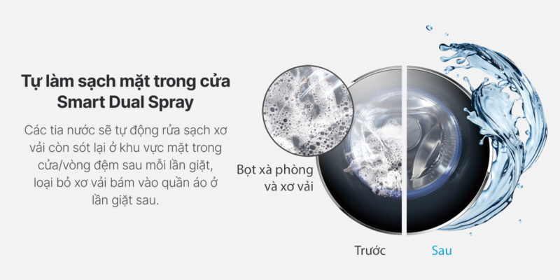 - Máy được trang bị loạt công nghệ thông minh như AI Smart Wash tự động nhận diện khối lượng và chất liệu vải để tối ưu nước giặt. Smart Dual Spray giúp làm sạch mặt trong cửa và vòng đệm, hạn chế cặn bẩn và mùi hôi. Kết hợp công nghệ cân bằng AI DBT, máy vận hành êm ái, giảm rung lắc ngay cả khi giặt tải lớn.