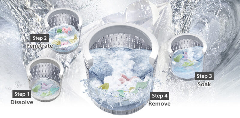 Công nghệ giặt 4 bước (hòa tan – thẩm thấu – ngâm – giặt) giúp nước giặt thấm sâu vào từng sợi vải, đánh bay vết bẩn cứng đầu. Đồng thời, máy kiểm soát mực nước hợp lý để tối ưu khả năng làm sạch và tiết kiệm nước.