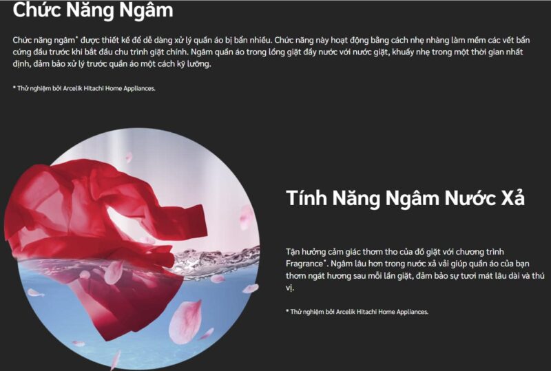 Chế độ ngâm giúp làm mềm và xử lý các vết bẩn cứng đầu trước khi bước vào chu trình giặt chính, nâng cao hiệu quả làm sạch. Ở lần xả cuối, máy còn có chế độ ngâm nước xả vải lâu hơn, giúp hương thơm thấm sâu vào từng sợi vải, mang lại cảm giác quần áo thơm mát và dễ chịu suốt cả ngày.