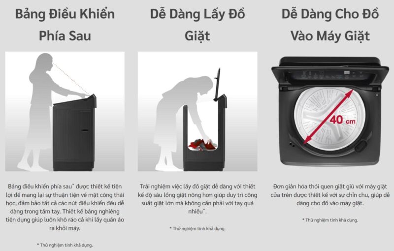 - Lồng giặt nông và cửa rộng tiện lợi