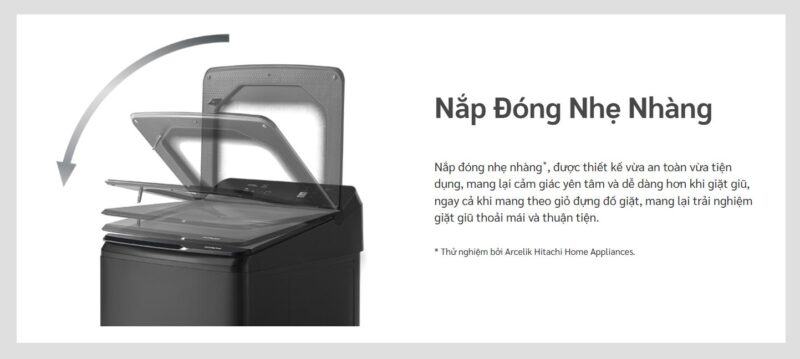 Nắp máy sử dụng kính cường lực chắc chắn, chống trầy xước và mang lại vẻ ngoài sang trọng cho không gian giặt giũ. Cơ chế đóng nhẹ nhàng Soft Close giúp nắp hạ xuống từ từ, tránh kẹt tay và hạn chế tiếng ồn. Ngoài ra, khóa nắp an toàn đảm bảo nắp không thể mở ra trong quá trình máy đang hoạt động, tăng cường độ an toàn cho gia đình có trẻ nhỏ.
