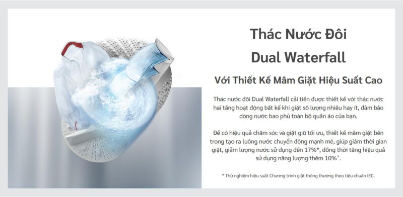 - Các chế độ chăm sóc quần áo như chống rối, giặt tay cho vải mỏng, ngâm sâu và lưu hương giúp bảo vệ sợi vải hiệu quả và mang lại quần áo thơm mềm lâu hơn. Hệ thống tối ưu dòng nước Aqua Jet cùng thác nước đôi Dual Waterfall không chỉ nâng cao hiệu quả làm sạch mà còn giúp tiết kiệm nước và năng lượng đáng kể. Ngăn chứa chất giặt linh hoạt với các vạch định lượng trực quan giúp hòa tan chất giặt tẩy tốt và hạn chế cặn bột giặt bám lại trên quần áo.