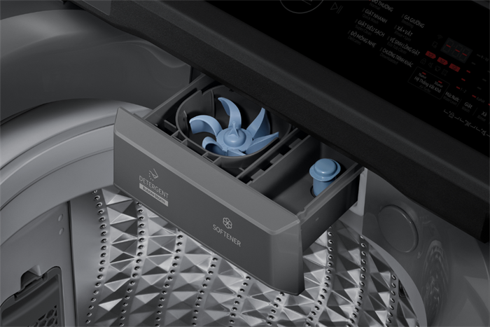 - Ngăn chứa nước giặt và nước xả tự động: Được thiết kế để cấp dung dịch đúng giai đoạn, giúp tối ưu hiệu quả giặt – xả và hạn chế cặn bám trên quần áo.