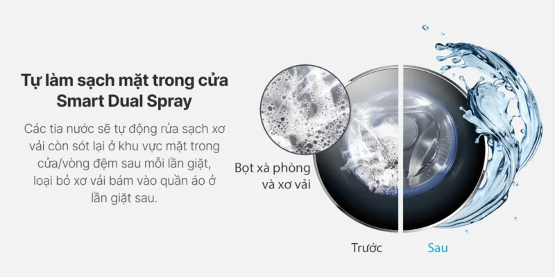 Hệ thống Smart Dual Spray tự động làm sạch mặt trong cửa và vòng đệm sau mỗi chu trình giặt. Tính năng này giúp ngăn cặn bẩn tích tụ, giữ lồng giặt luôn sạch và kéo dài tuổi thọ máy.
