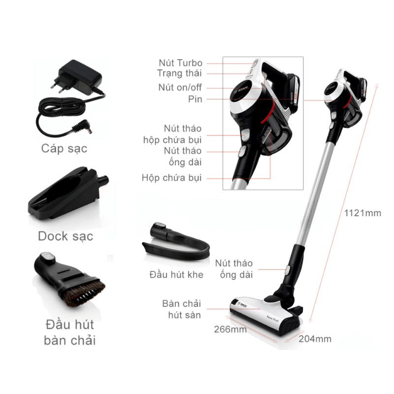 - Phụ kiện đầy đủ: Gồm đầu hút khe XXL, bộ pin, dây cáp sạc và dock sạc, giúp mở rộng khả năng làm sạch ở nhiều khu vực.