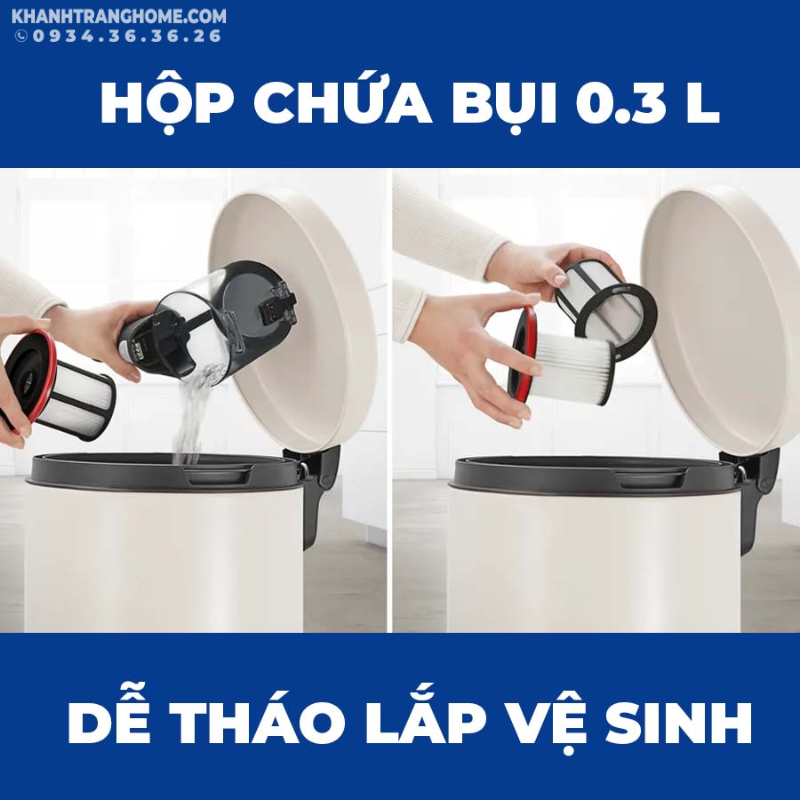 - Khoang chứa bụi tiện lợi: Loại M, không cần túi đựng rác, dễ dàng tháo ra để vệ sinh.