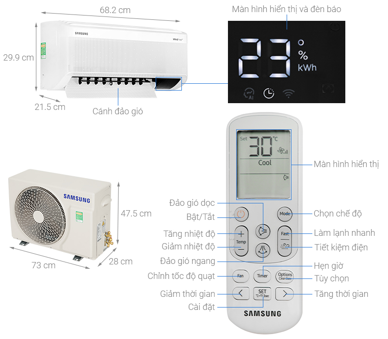 - Kích thước dàn lạnh (RxSxC): 682 × 215 × 299 mm