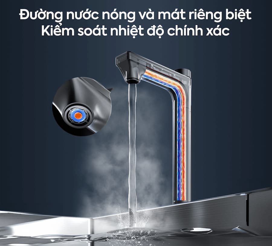 Máy sử dụng công nghệ lọc RO giúp loại bỏ hiệu quả cặn bẩn, vi khuẩn, kim loại nặng và nhiều tạp chất trong nước, mang lại nguồn nước sạch và an toàn cho người sử dụng. - Chức năng làm nước nóng tiện lợi
