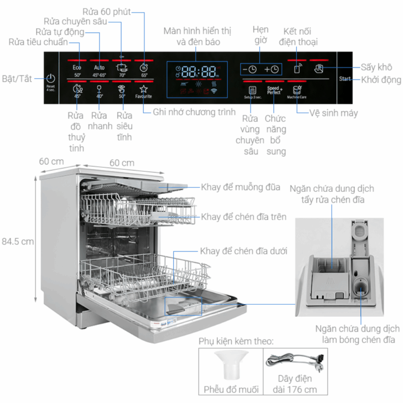 - Đèn LED thông báo thông minh: Các đèn báo hết muối, hết nước làm bóng giúp bạn dễ dàng theo dõi và bổ sung kịp thời, đảm bảo máy luôn hoạt động hiệu quả và duy trì chất lượng rửa tốt nhất.