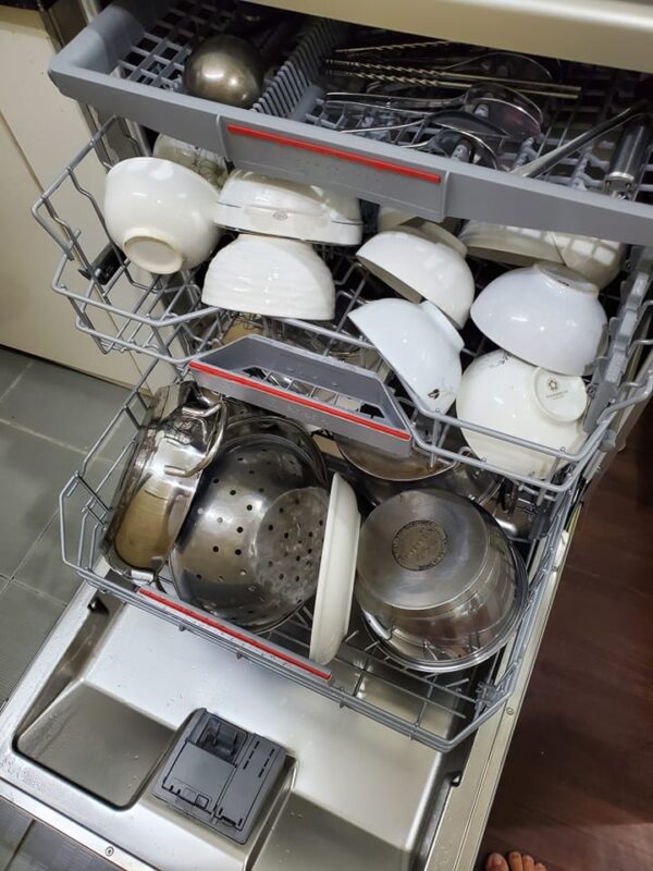 Máy chạy siêu êm, rửa sạch bong kể cả nồi chảo nhiều dầu mỡ. Mình chọn dòng này vì có nhiều chương trình rửa và tiết kiệm nước nữa. Sau khi dùng rồi thấy xứng đáng từng đồng tiền lun, biết dị mua từ lâu thì nhàn rồi hihihihi 😛