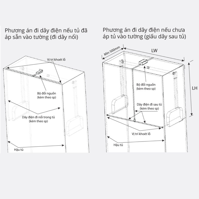 - Kích thước lọt lòng tủ (LW/mm): Chiều rộng lọt lòng (LW): 930-1500 và Chiều cao lọt lòng (LH): ≥750