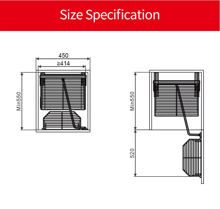 Tủ kho được thiết kế để lắp âm vào khoang tủ rộng 450 mm, tương thích với nhiều mẫu tủ bếp phổ biến hiện nay. Việc lắp đặt nhanh chóng và dễ dàng giúp người dùng tiết kiệm thời gian thi công. Đồng thời, các rổ chứa có thể tháo rời để vệ sinh nhanh chóng và thuận tiện.