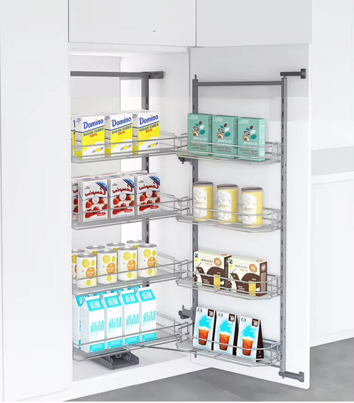 Tủ kho được thiết kế để lắp âm vào khoang tủ rộng 450 mm, phù hợp với nhiều hệ tủ bếp hiện nay. Các rổ chứa có thể tháo rời dễ dàng, giúp việc vệ sinh lau chùi sau thời gian sử dụng trở nên đơn giản và nhanh chóng hơn.