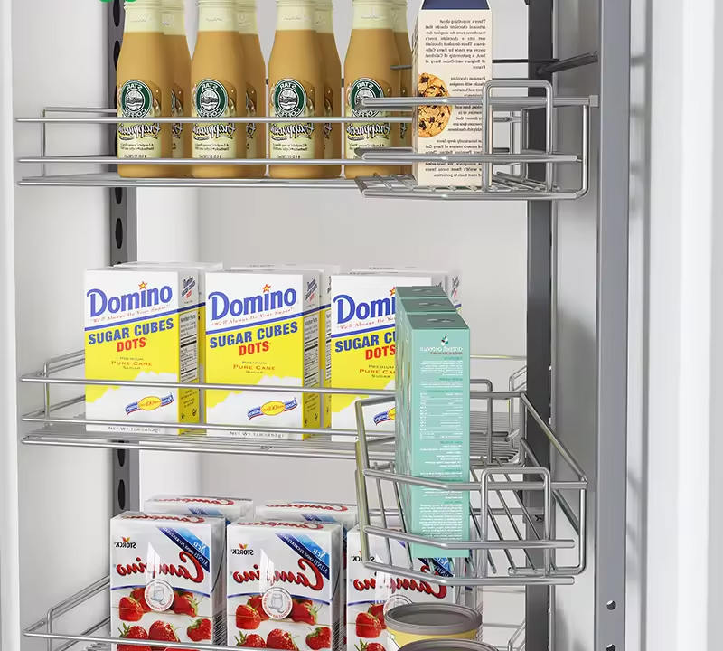 Khi mở cánh, toàn bộ rổ chứa sẽ trượt ra ngoài theo liên kết, giúp bạn dễ dàng quan sát và lấy đồ phía sâu bên trong. Cơ chế này tiết kiệm thời gian và hạn chế việc phải với tay sâu vào khoang tủ, đặc biệt hữu ích với gia đình thường xuyên nấu nướng.