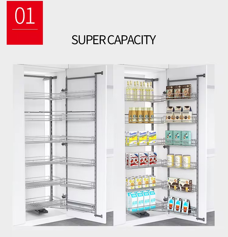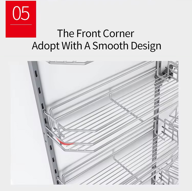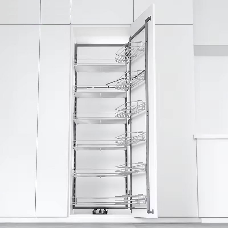 Khi mở cánh, toàn bộ hệ rổ liên kết trượt ra ngoài, giúp bạn dễ dàng quan sát và lấy đồ sâu trong tủ mà không phải với tay khó khăn. Đây là một tính năng rất hữu ích trong điều kiện bếp nhỏ hoặc khi lưu trữ đồ dùng thường xuyên.