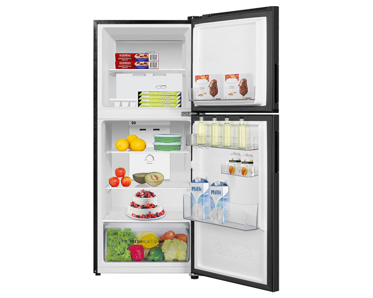 Tủ lạnh sở hữu kiểu dáng ngăn đá trên quen thuộc với kích thước gọn gàng, phù hợp nhiều không gian bếp. Gam màu đen ánh kim lấy cảm hứng từ các chòm sao tạo điểm nhấn hiện đại, tinh tế. Mặt cửa thép bền bỉ, hạn chế bám bẩn, dễ lau chùi.