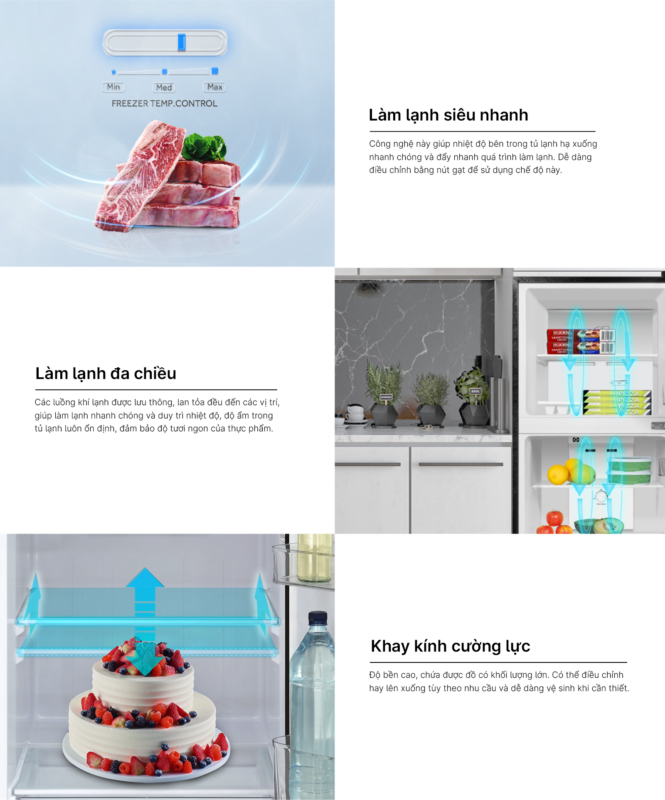 Hệ thống làm lạnh gián tiếp giúp hơi lạnh lan tỏa đều khắp các ngăn. Nhờ đó, thực phẩm được làm lạnh ổn định mà không bị đóng tuyết cục bộ. Người dùng không còn mất thời gian xả tuyết thủ công như trước. - Làm lạnh đa chiều giữ thực phẩm tươi lâu