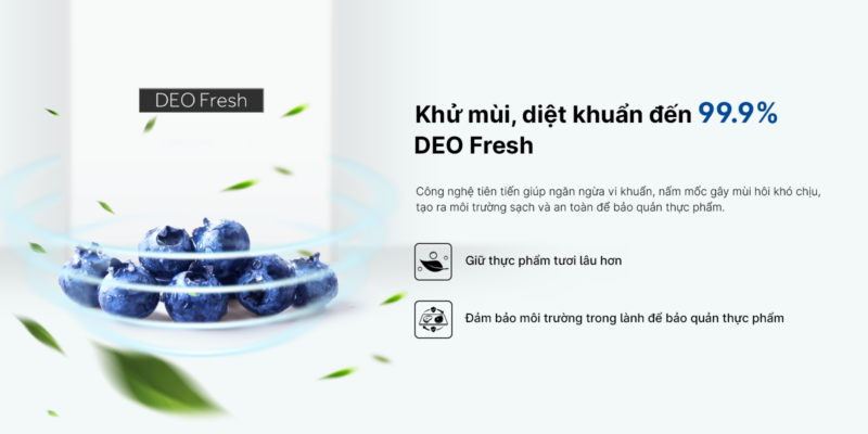Công nghệ DEO Fresh với phân tử Nano bạc giúp ngăn chặn vi khuẩn gây hại và loại bỏ mùi hôi khó chịu. Không khí bên trong tủ luôn trong lành, sạch sẽ và an toàn cho sức khỏe. Thực phẩm không bị ám mùi, đảm bảo chất lượng bảo quản.