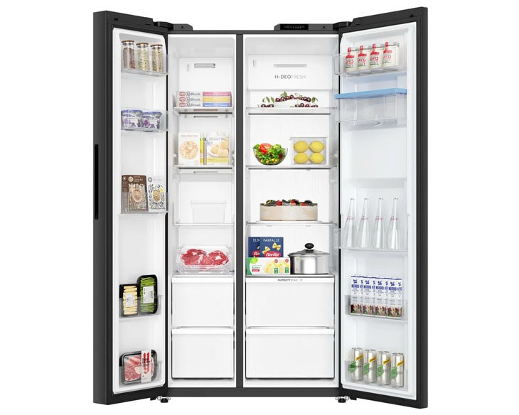 - Khả năng bảo quản thực phẩm của tủ được nâng cao nhờ công nghệ làm lạnh đa chiều phân bổ khí lạnh đều mọi ngóc ngách, giữ nhiệt độ ổn định và làm thực phẩm tươi lâu hơn. Ngăn rau củ riêng biệt được trang bị màng lọc HCS cân bằng độ ẩm tối ưu, giúp rau củ quả luôn mọng nước và giữ được độ tươi ngon. Bên cạnh đó, công nghệ H-DEO Fresh với than hoạt tính và ion bạc khử mùi và diệt khuẩn hiệu quả, giữ không gian bên trong tủ luôn trong lành và an toàn cho thực phẩm.