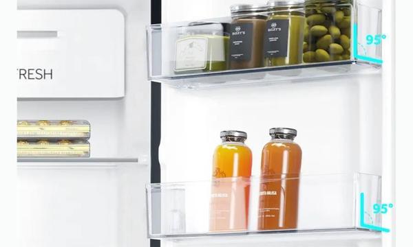 Thiết kế khay cửa mở nghiêng 95° giúp cố định chai lọ chắc chắn, hạn chế rơi đổ khi mở cửa mạnh. Giải pháp này mang lại sự an tâm và tiện lợi trong quá trình sử dụng hằng ngày. Đồng thời giúp tối ưu không gian lưu trữ các chai dung tích lớn.