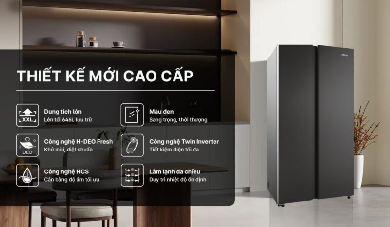 - Tủ lạnh Aqua Inverter 646 lít AQR-S682XA(BL) gây ấn tượng với thiết kế Side by Side cao cấp, gam màu đen sang trọng dễ phối hợp nhiều không gian bếp hiện đại. Bề mặt cửa bằng thép chắc chắn, hạn chế trầy xước và mang lại cảm giác bền bỉ khi sử dụng lâu dài. Kiểu dáng lớn, cân đối giúp không gian bếp trở nên đẳng cấp và gọn gàng hơn.
