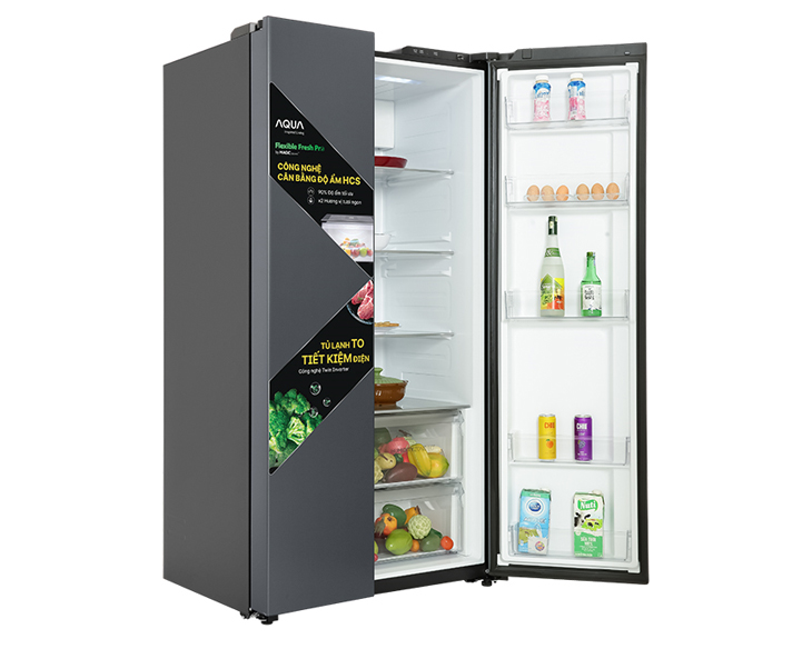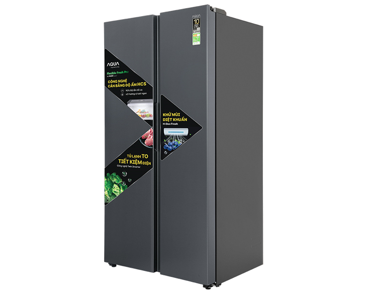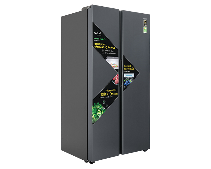 - Tủ lạnh Aqua Inverter 646 lít AQR-S682XA(SLB) nổi bật với thiết kế Side by Side hiện đại, cửa thép không gỉ gam xám khói sang trọng, dễ phối hợp với nhiều không gian bếp cao cấp. Kiểu dáng bề thế cùng dung tích lớn giúp sản phẩm trở thành điểm nhấn ấn tượng, đặc biệt phù hợp cho gia đình đông người trên 5 thành viên.
