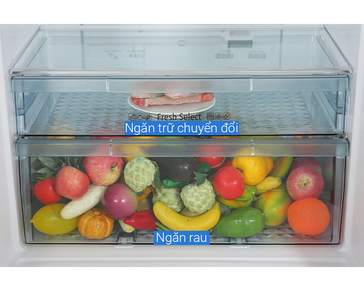 Công nghệ Nano Titanium sử dụng chất xúc tác TiO₂ giúp loại bỏ vi khuẩn và mùi hôi hiệu quả. Nhờ đó, không khí trong tủ luôn trong lành, thực phẩm không bị lẫn mùi. Công nghệ này góp phần bảo vệ sức khỏe cho cả gia đình. - Ngăn trữ chuyển đổi Fresh Select linh hoạt