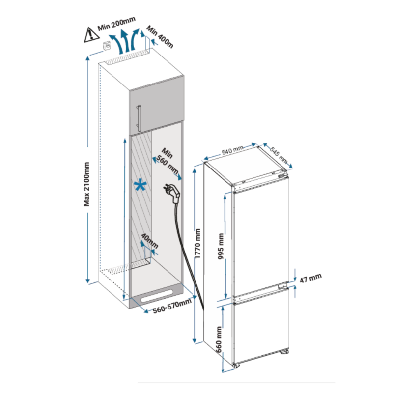 - Kích thước lắp âm tủ: 560–570 mm (rộng) x 550 mm (sâu) x 2000 mm (cao)