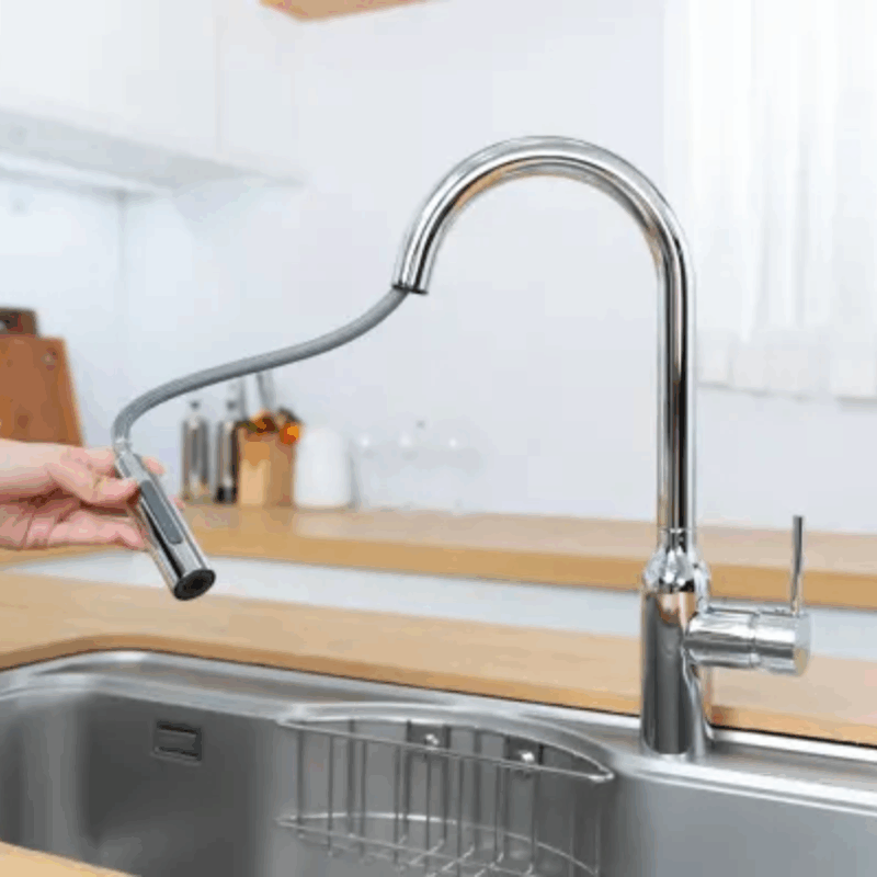 - Công năng dây rút linh hoạt – tiện dụng tối đa: Trang bị dây rút mở rộng phạm vi rửa, người dùng dễ dàng kéo đầu vòi ra xa, thuận tiện khi rửa chén, tráng bồn hay làm sạch rau củ. Thiết kế thông minh này giúp tối ưu không gian sử dụng, đặc biệt phù hợp với những căn bếp nhỏ gọn nhưng yêu cầu tính linh hoạt cao.
