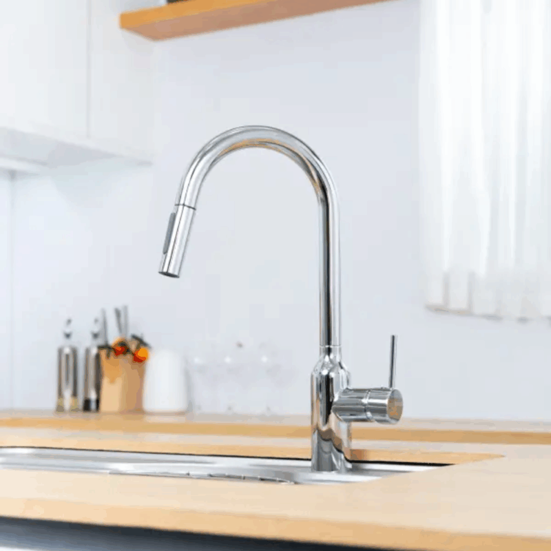 - Kiểu dáng: Đầu vòi cong thanh mảnh, dây rút linh hoạt giúp mở rộng phạm vi rửa và điều chỉnh dòng nước dễ dàng