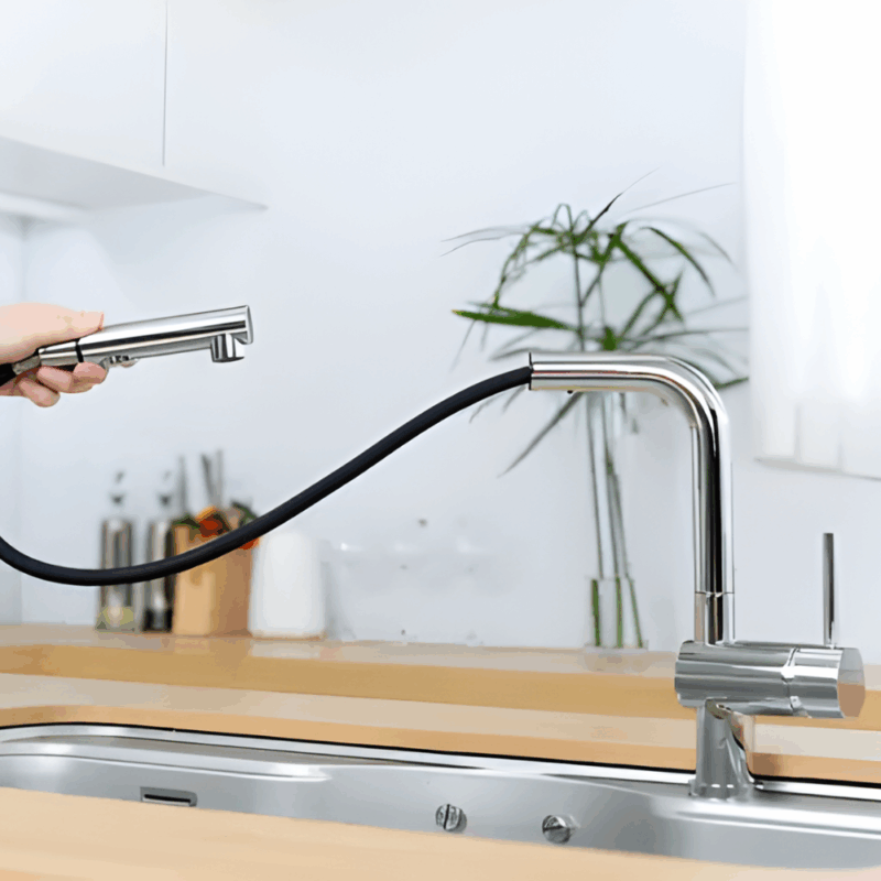 - Dây rút xoay 360° – linh hoạt tối đa: Trang bị dây rút nóng lạnh xoay 360 độ, giúp mở rộng phạm vi tiếp cận khi rửa chén, tráng bồn hoặc vệ sinh khu vực xung quanh. Thiết kế thông minh này giúp thao tác bếp trở nên dễ dàng, nhanh chóng và tiện lợi hơn bao giờ hết.